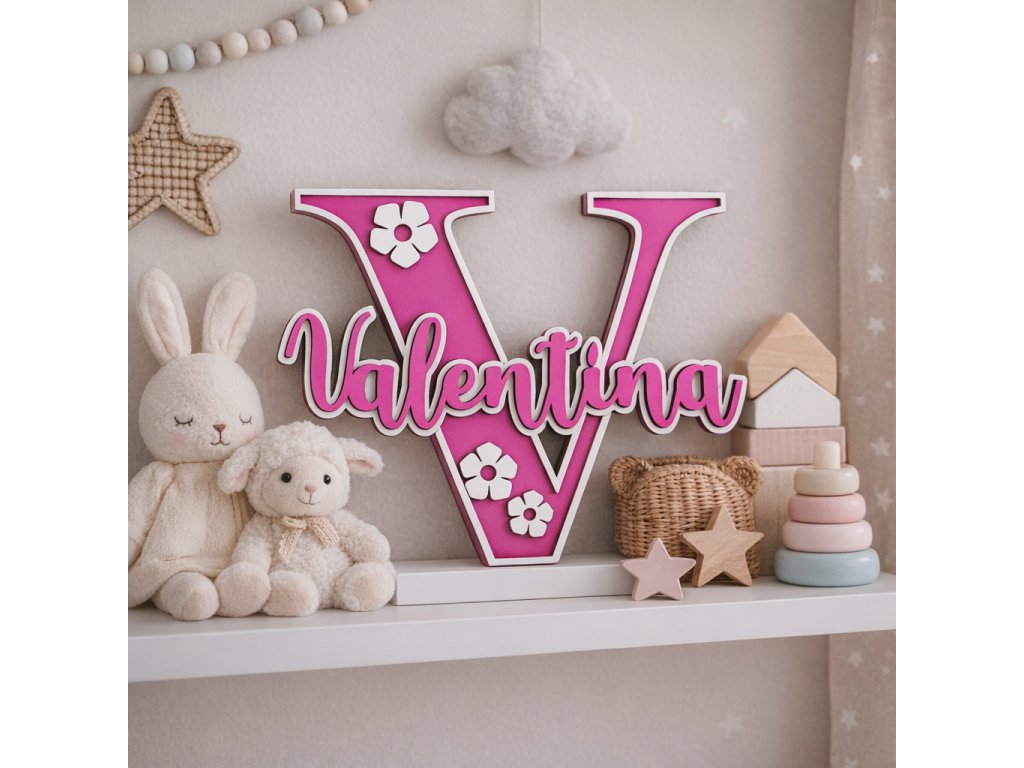 Základ tvorí veľké začiatočné písmeno, doplnené o lepené meno dieťatka a jemné dekoratívne prvky. Farebné prevedenie je možné prispôsobiť podľa želania, aby menovka dokonale ladila s detskou izbou.