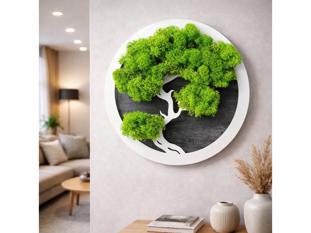 Výnimočná interiérová dekorácia, ktorá spája symboliku bonsaja s moderným dizajnom. Tento bonsaj je vytvorený zo stabilizovaného machu, starostlivo ručne lepeného do tvaru koruny stromu, osadeného v bielom kruhovom ráme.