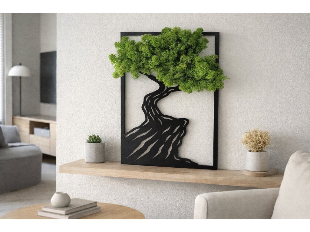 Minimalistický čierny rám stromu v kombinácii so zeleným machom vytvára harmonický kontrast, ktorý sa perfektne hodí do moderných obývačiek, kancelárií, chodieb alebo spální. Obraz je umiestnený v ráme, pričom pozadie tvorí farba steny, vďaka čomu prirodzene zapadne do každého priestoru.
