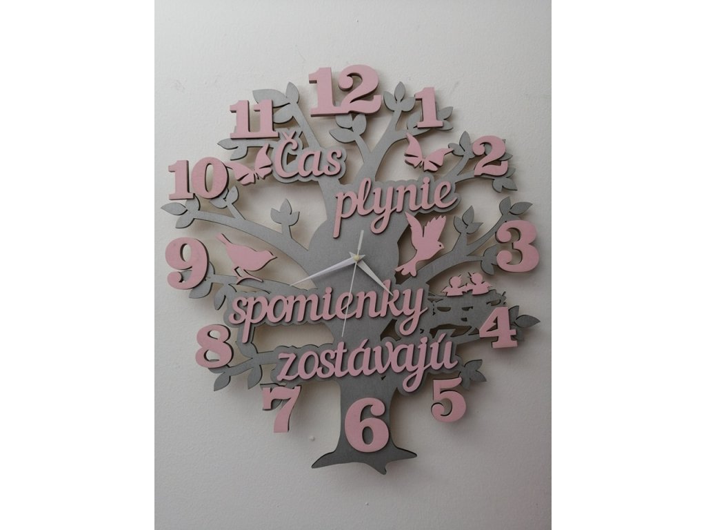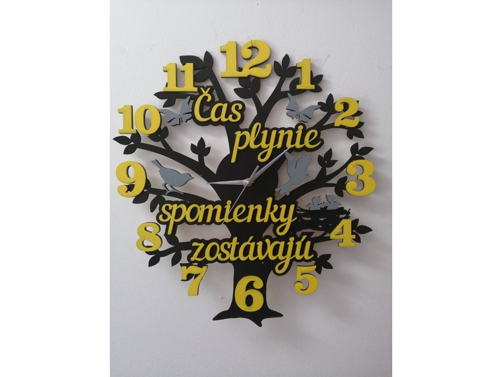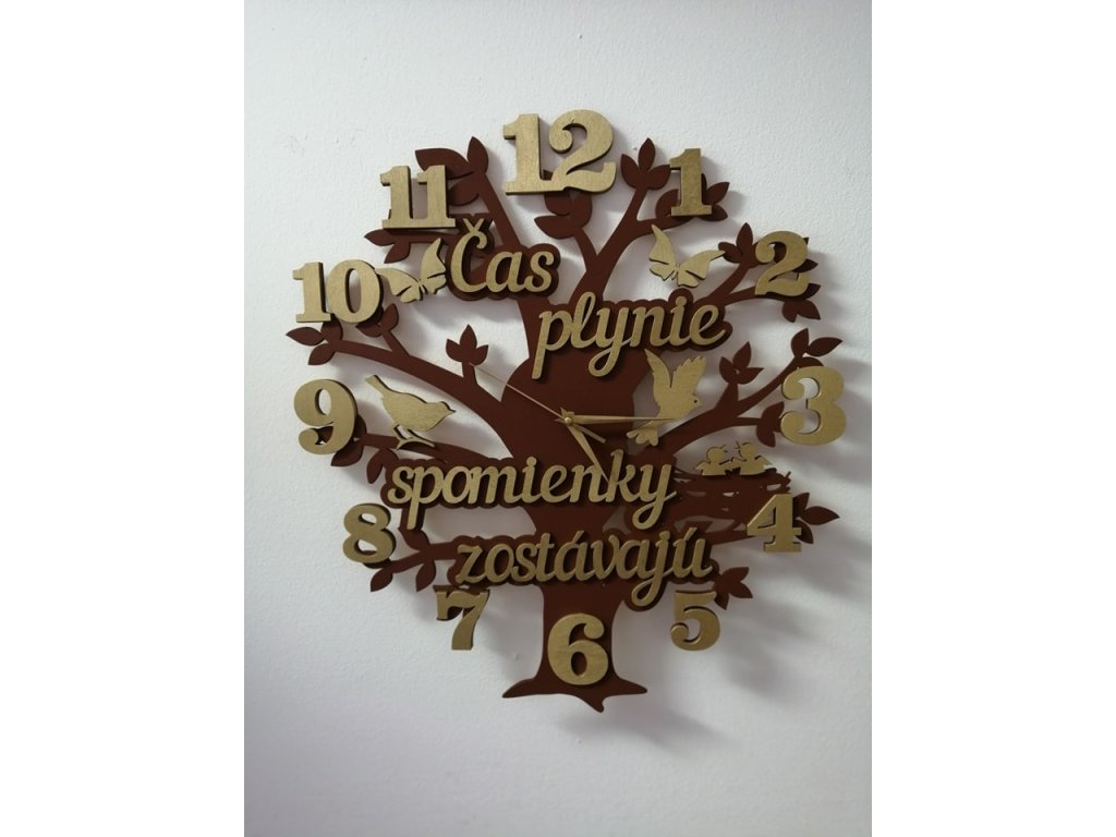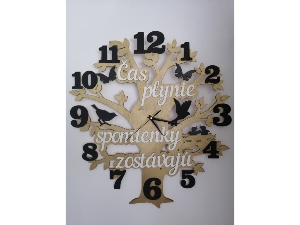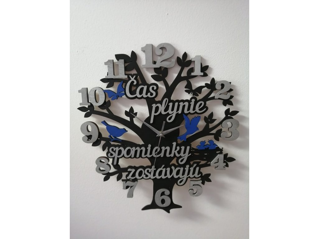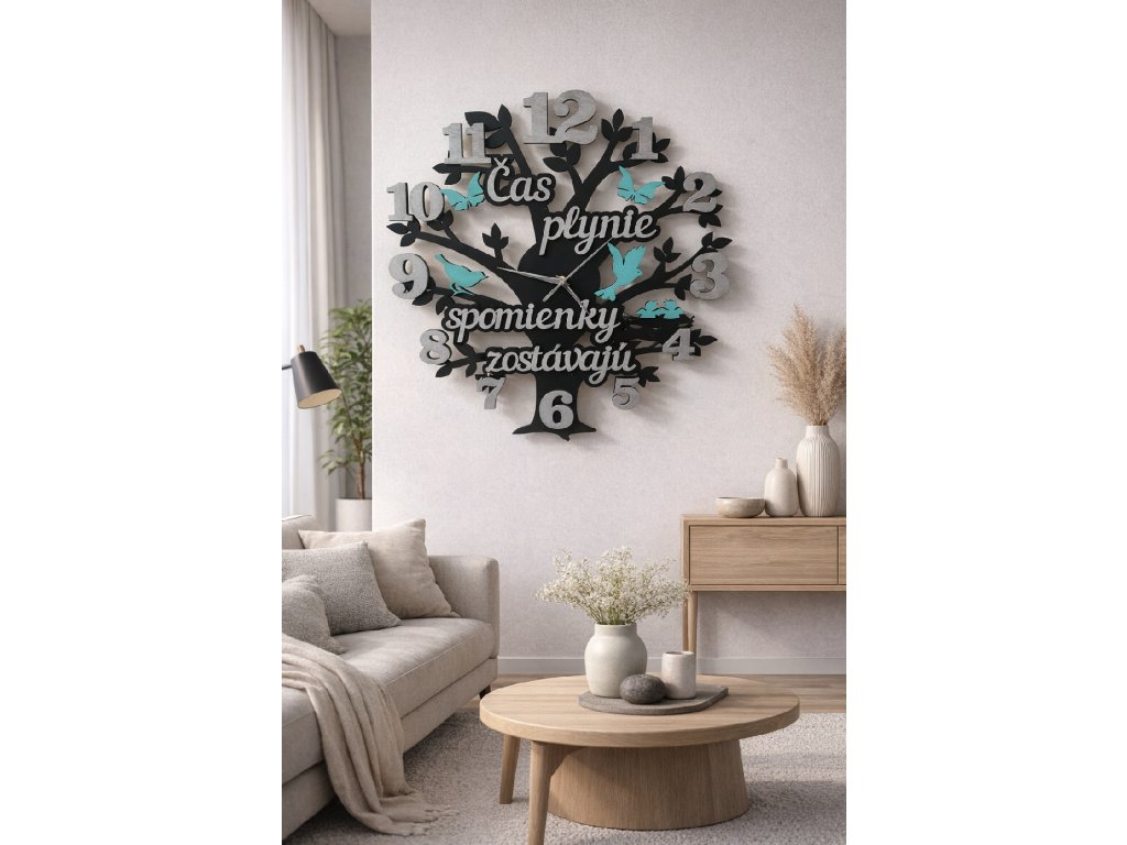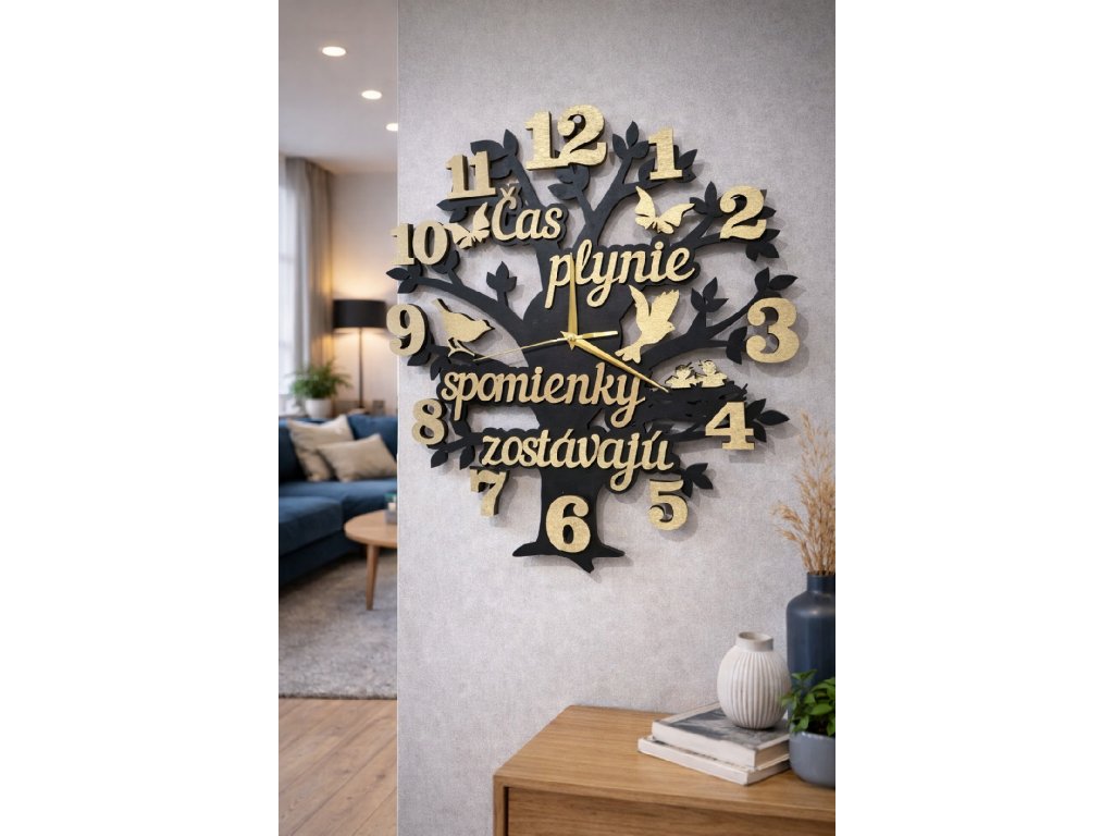 Naše nástenné hodiny nie sú len praktickým doplnkom, ale výraznou dizajnovou dekoráciou s príbehom. Motív stromu symbolizuje život, rast a plynutie času, zatiaľ čo jemné detaily a text pripomínajú, že hoci čas plynie, spomienky zostávajú navždy.
