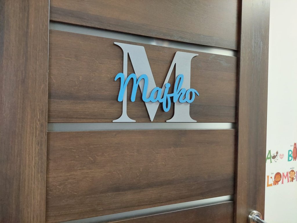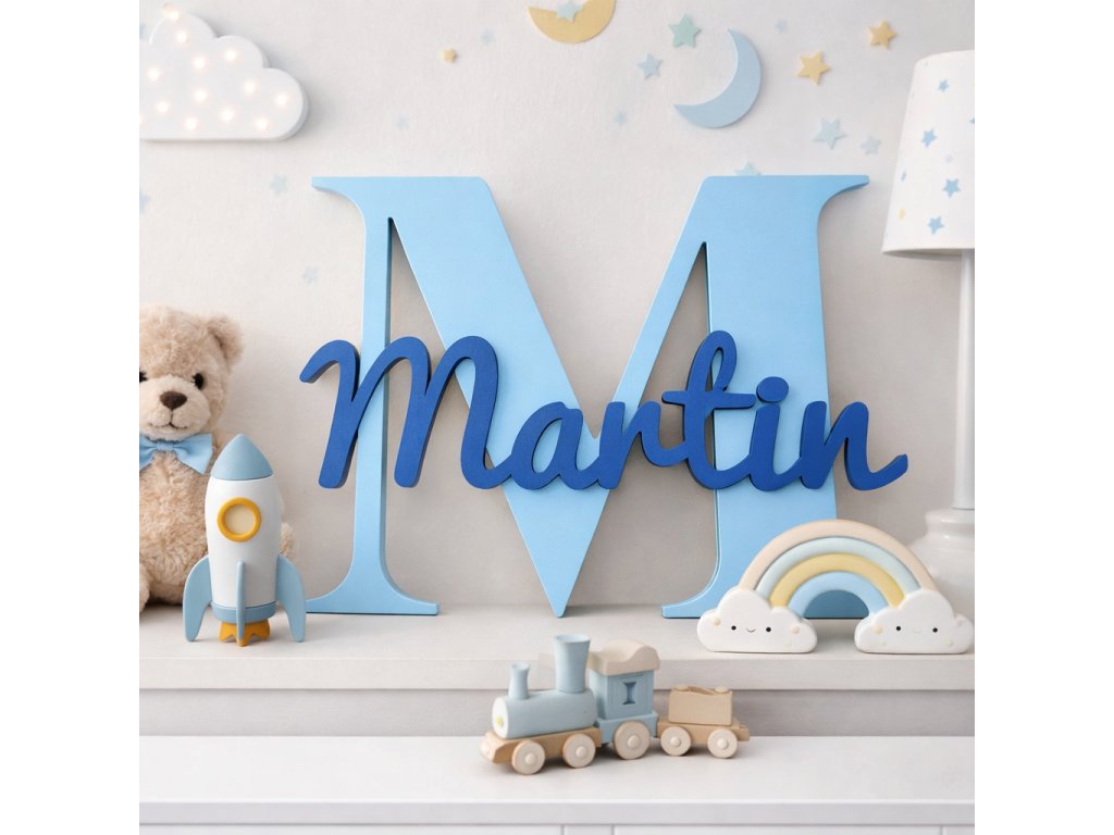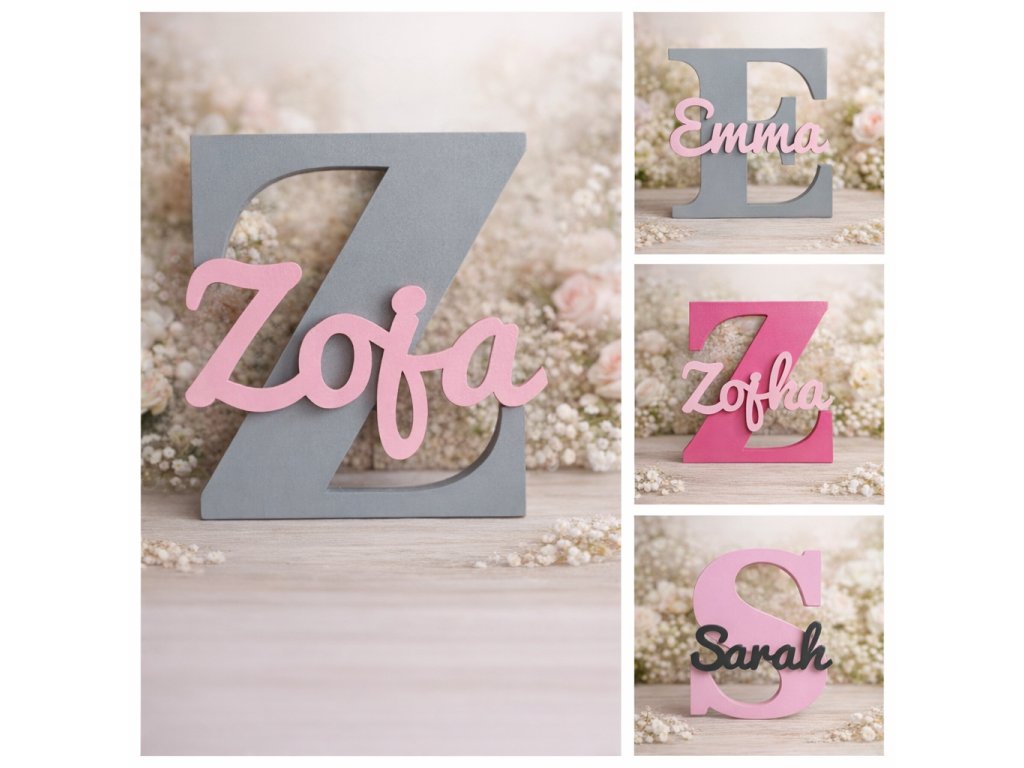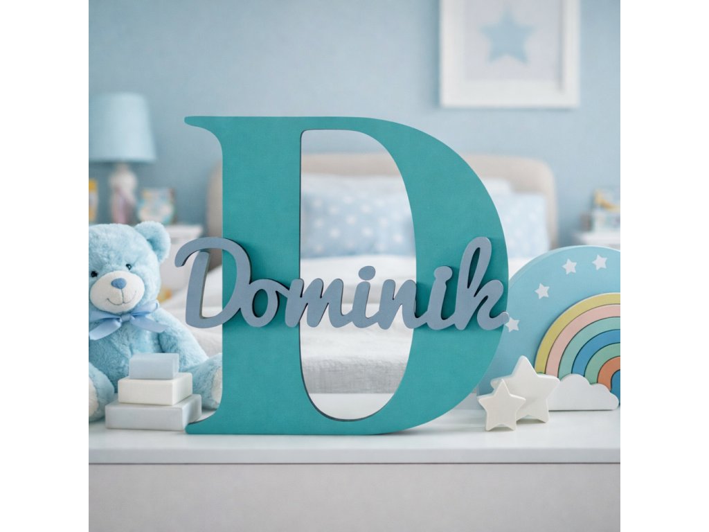 Menovka má výšku 20 cm a pozostáva z veľkého začiatočného písmena, na ktoré je lepené meno dieťatka s jemným 3D efektom. Farebné prevedenie si môžete zvoliť podľa vlastného vkusu, vďaka čomu menovka dokonale ladí s interiérom – či už pre dievčatko alebo chlapčeka.