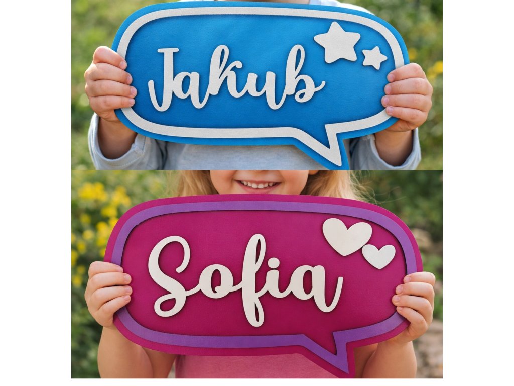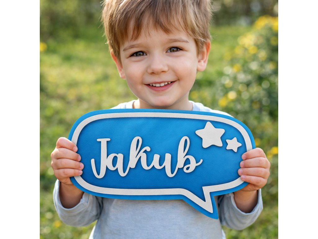 Tvar rozprávacej bubliny v kombinácii s menom dieťaťa vytvára originálny dizajn, ktorý je vhodný pre chlapčeka aj dievčatko.
