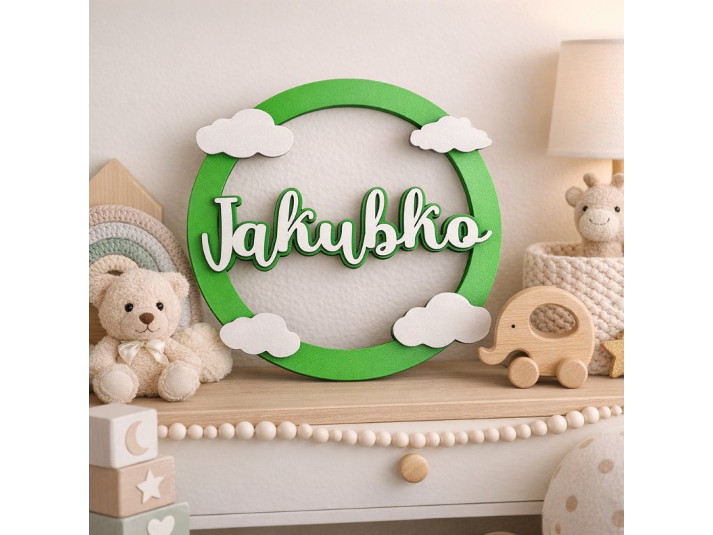 Meno dieťatka je lepené a vytvára jemný 3D efekt. Farebné prevedenie kruhu aj mena si môžete zvoliť podľa vlastných predstáv, aby menovka dokonale ladila s interiérom detskej izby.