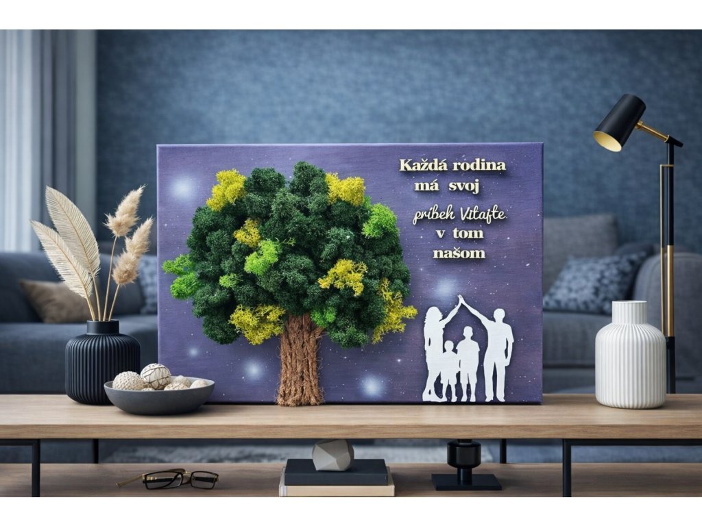 Významný a hrejivý obraz, ktorý symbolizuje rodinu, domov a spoločný príbeh. Dominantným prvkom je strom zo stabilizovaného machu, ktorého koruna predstavuje silu, ochranu a spojenie. Dopĺňa ho jemný motivačný text:
