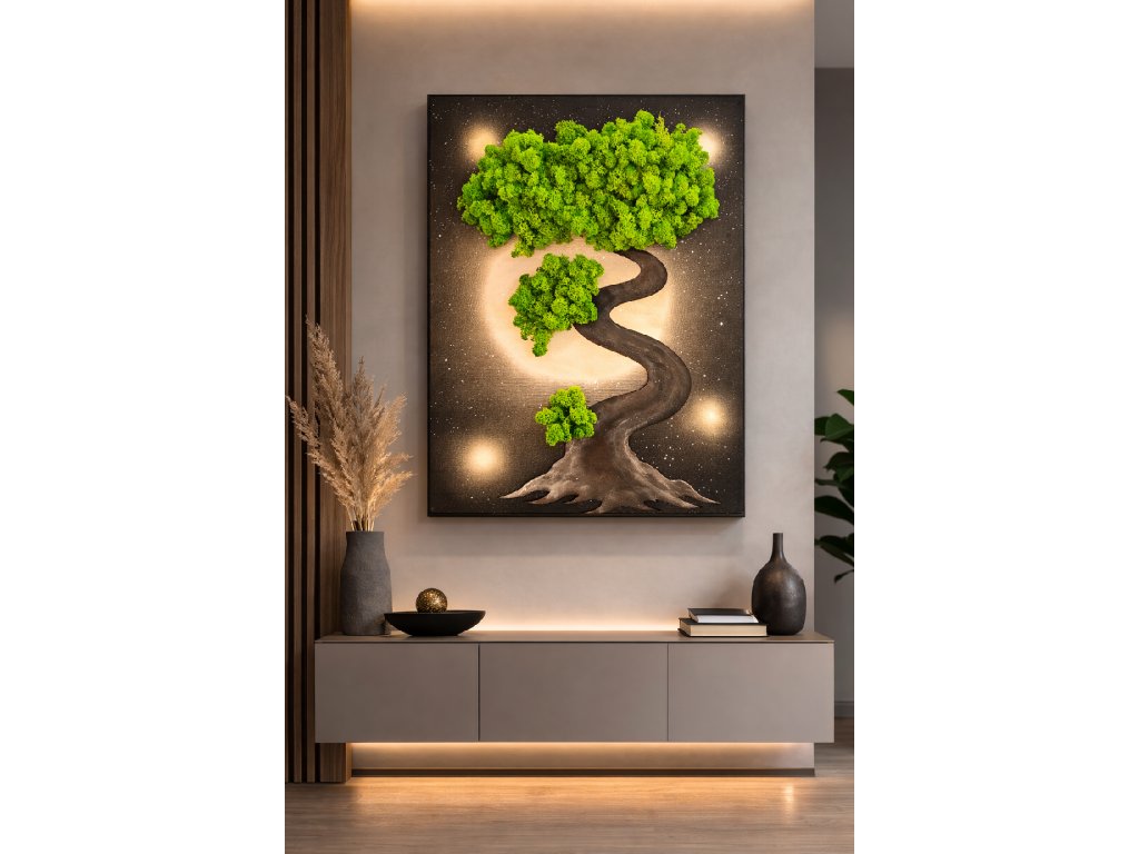 Originálny ručne vyrábaný obraz, ktorý prinesie do vášho interiéru kúsok prírody a harmónie. Dominantou obrazu je štýlový strom vytvorený zo stabilizovaného machu v žiarivo zelenej farbe, ktorý v kombinácii s moderným pozadím vytvára elegantný a upokojujúci vizuálny efekt.