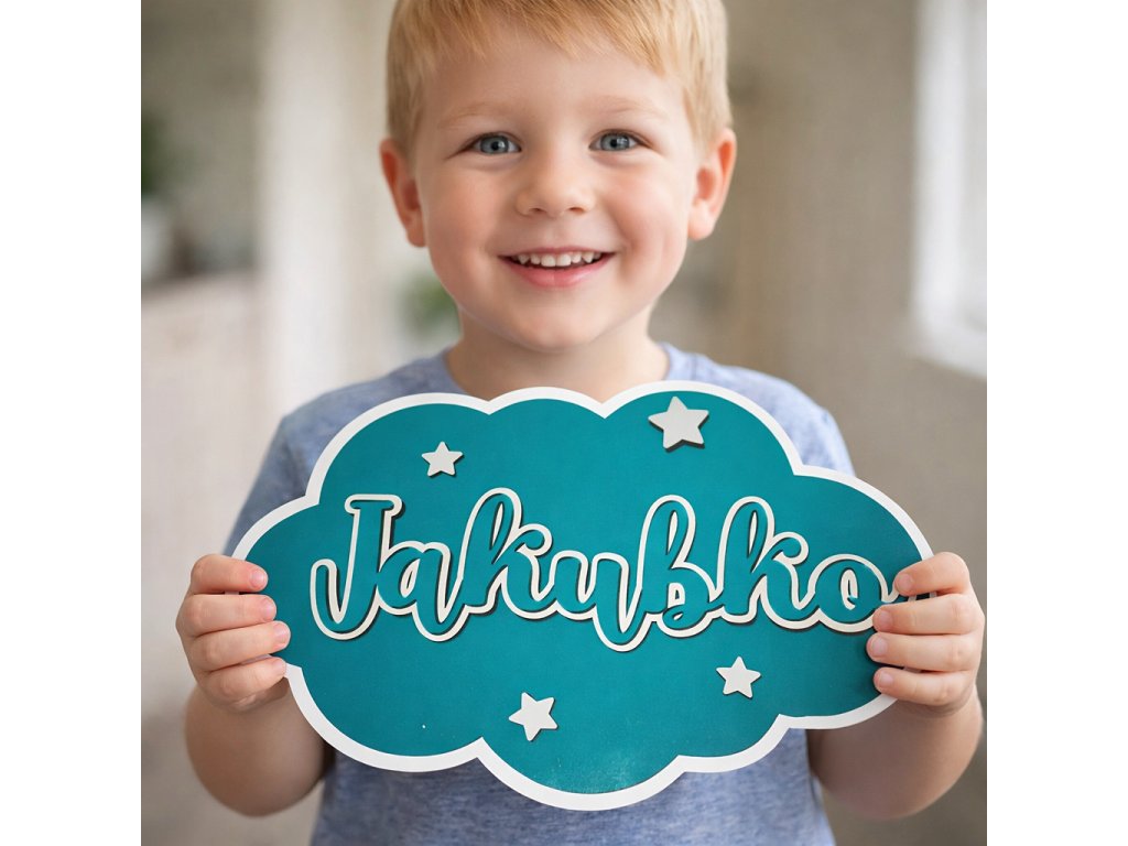 Hravá a výrazná drevená menovka v tvare obláčika, ktorá zaručene upúta pozornosť v každej detskej izbe. Menovka má dĺžku 30 cm a je vyrobená ako 4-vrstvový dizajn, vďaka čomu pôsobí bohato, plasticky a kvalitne.