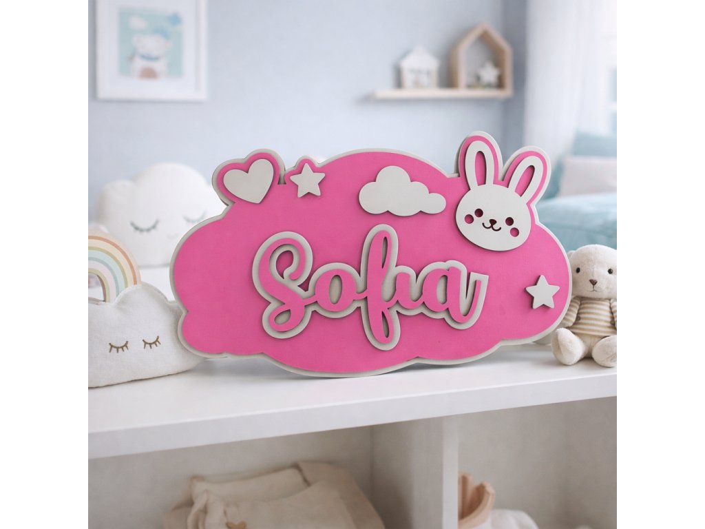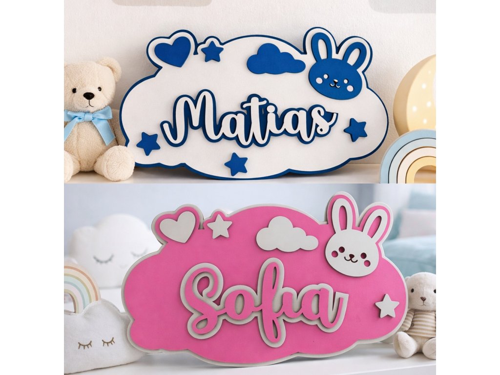 Menovka v tvare obláčika je doplnená o roztomilé motívy (hviezdičky, srdiečko, obláčik a zajačik) a meno dieťaťa, vďaka čomu vzniká jedinečný personalizovaný kúsok.