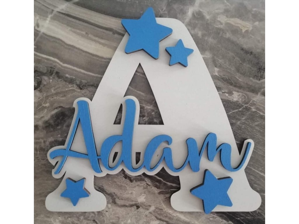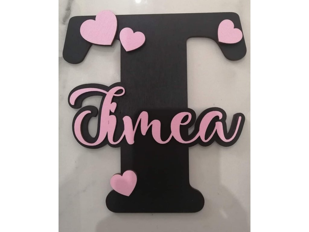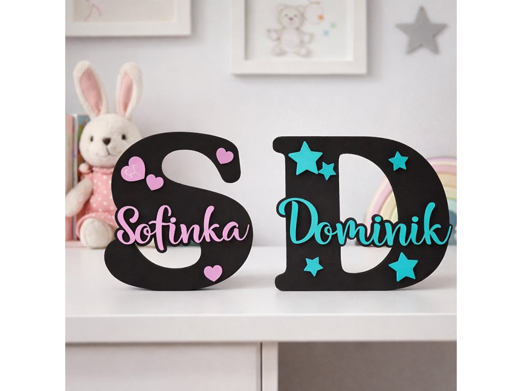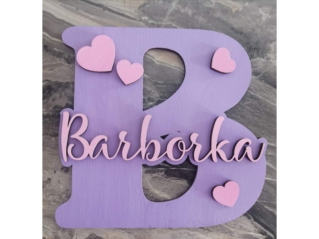 Moderná a výrazná drevená menovka do detskej izby, ktorá zaujme na prvý pohľad. Menovka má výšku 20 cm a pozostáva z veľkého začiatočného písmena, na ktoré je lepené meno dieťatka s jemným 3D efektom. Dekoratívne prvky (srdiečka alebo hviezdičky) dodávajú menovke hravý a osobitý charakter.