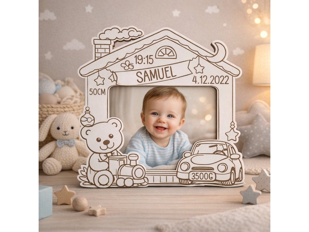 Drevený detský rámik s nežným motívom domčeka, medvedíka a autíčka je krásnou pamiatkou na deň narodenia dieťatka. Určený na fotografiu 10 × 15 cm, doplnený o gravírované meno a údaje o narodení. Ideálny ako darček pre novorodenca alebo dekorácia do detskej izby 🤍