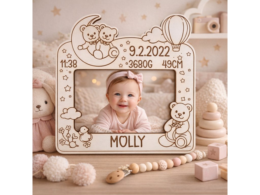 Drevený detský rámik s nežným motívom mesiaca, hviezdičiek a medvedíkov je krásnou pamiatkou na deň narodenia dieťatka. Určený na fotografiu 10 × 15 cm, doplnený o gravírované meno a údaje o narodení. Ideálny ako darček pre novorodenca alebo dekorácia do detskej izby 🌙🤍