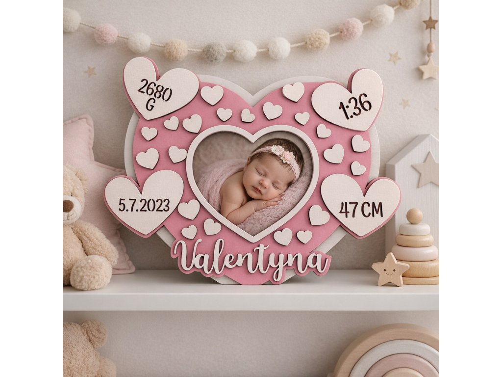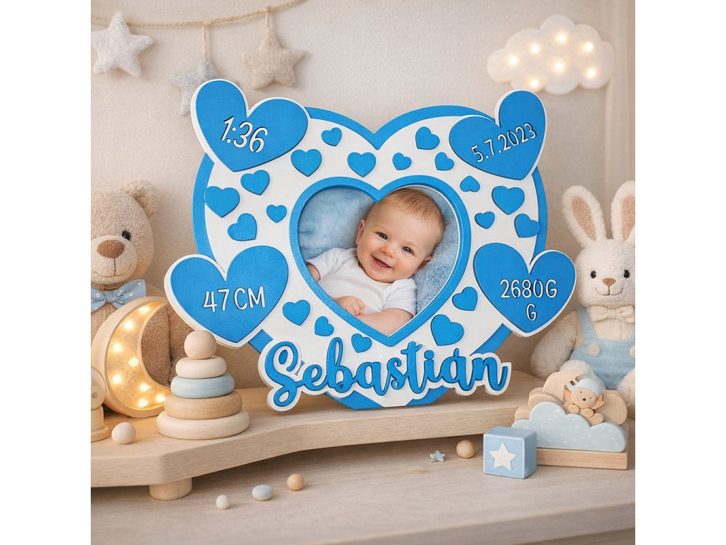 Rámik je navrhnutý na fotografiu vo formáte 10 × 15 cm a doplnený o meno dieťaťa a dôležité údaje z narodenia – dátum, čas, váhu a výšku.