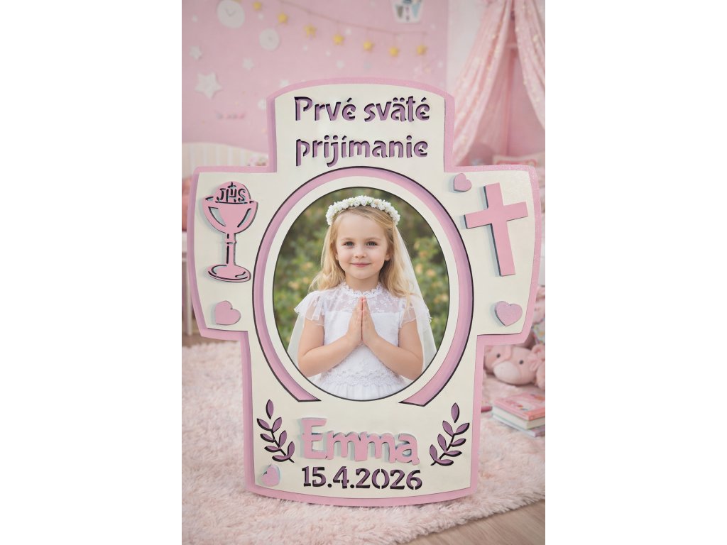 Dekoratívny rámik k Prvému svätému prijímaniu je navrhnutý v jemných ružových tónoch s motívmi kríža, kalicha a srdiečok. Ideálny na uchovanie fotografie z tohto slávnostného dňa.
