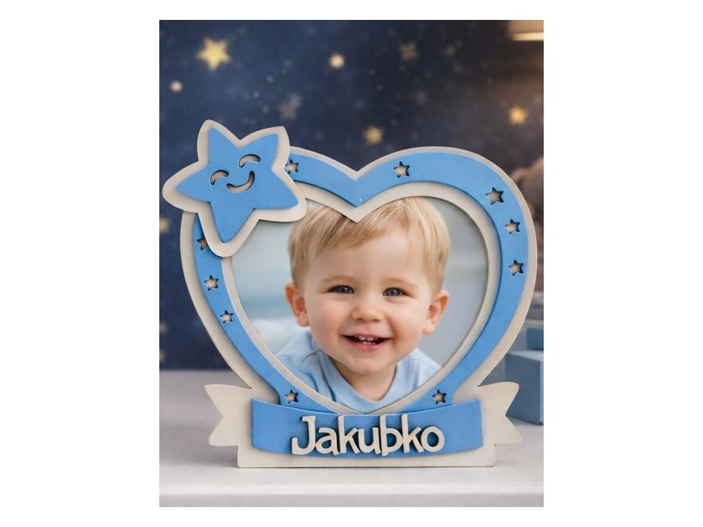 Rozkošný detský fotorámik v tvare srdiečka je krásnou spomienkou na prvé mesiace a roky vášho bábätka. Jemný dizajn so hviezdičkami a usmiatou hviezdou pôsobí nežne a hravo, vďaka čomu je vhodný pre dievčatko aj chlapčeka.